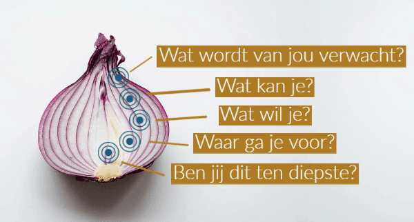 We hebben ‘de logische niveaus’ bewerkt tot een goed te begrijpen metafoor: De metafoor van de ui. De verschillende lagen in je gedrag zijn te vergelijken met de schillen van een ui. Niet alleen qua opbouw, maar ook als symbool: Door het afpellen van de ui kom je tot z’n kern.
